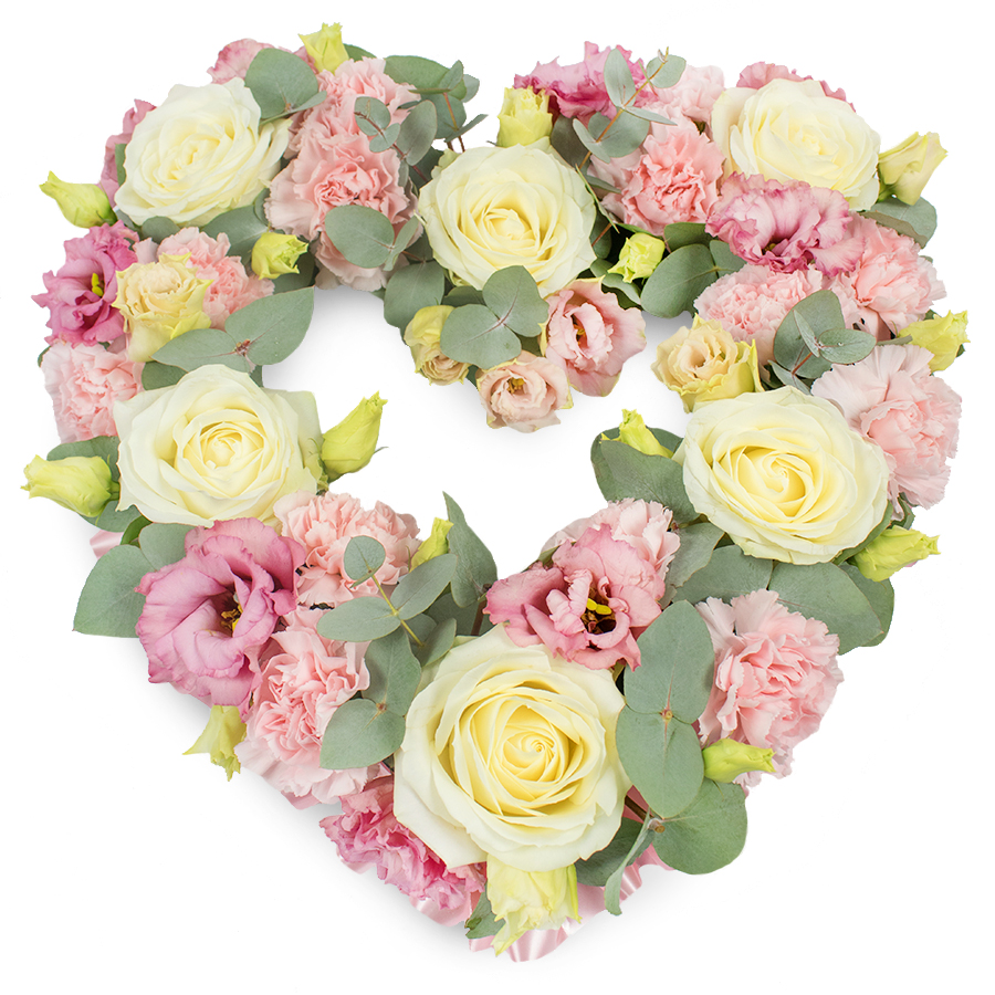 Honor your loved ones with our radiant open heart flower tribute. This elegant bouquet showcases hand-selected white roses, vibrant pink carnations, exquisite pink lisianthus, and fresh eucalyptus leaves, artfully arranged to symbolize enduring love and remembrance.
